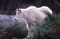 MOUNTAIN GOAT (Oreamnos americanus) is a hoofed mammal widespread in the mountainous Interior of the province, where it subsists on a wide variety of plants. About 60% of the N American population is found in BC, an estimated 50,000 animals. Adult males weigh 80–135 kg; females are smaller. A thick coat of fine white hair makes mountain goats visible high up on cliffsides, where they scramble with amazing agility. They have short, curved black horns, but unlike MOUNTAIN SHEEP, whose habitat...