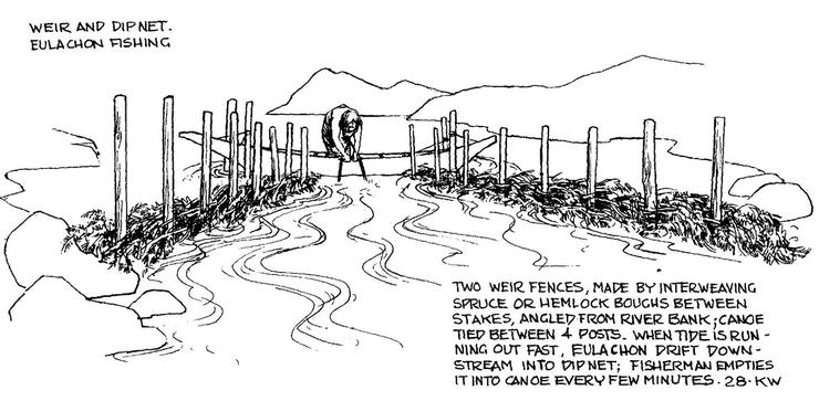 Downstream villagers owning weirs had first advantage in harvesting the run. When they had sufficient salmon, sections of the weir were removed to allow the fish to continue upriver, where they would encounter the weir of the next village. It is said that if the downstream people were tardy in opening the weir, their angry neighbours might launch a massive log into the fast flowing waters and smash it open.