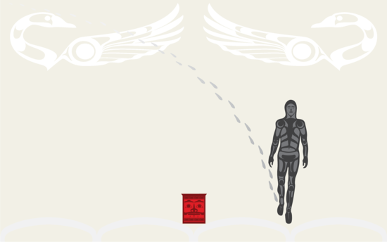 Many hours passed as he wandered over the clouds. Then something in the distance caught his eye. He walked over to the spot and he found a guloonich, a waterproof cedar box that is used as a water bucket. The box was full of fresh water. It had a little hole drilled into the top with a long broken-off hollow bone from the leg of a tall bird, a giant blue heron. The bones of many birds are hollow which makes them light enough to fly. In a water box, they are used as straws.