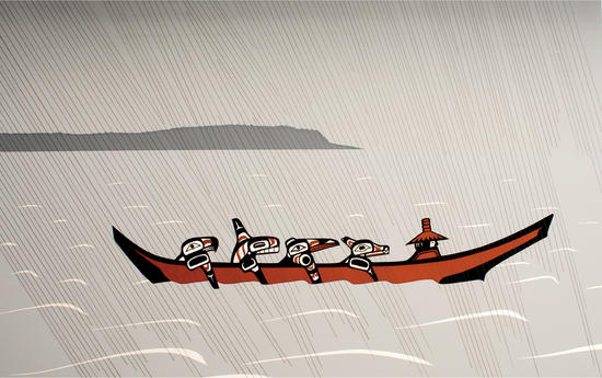 When Cloudwalker returned, there was great celebration in the village. Everyone believed his story, because where he had splashed a little water, there were new lakes. Where he had fallen down, spilling lots of water, there were three new rivers. If you could fly like an eagle over the north country, you would see Ksien, the juice from the clouds. You would see the Nass River, the juice from the clouds, and you would see the Stikine River, the juice from the clouds. The headwaters of those rivers are in a semicircle at the three points where Cloudwalker fell.