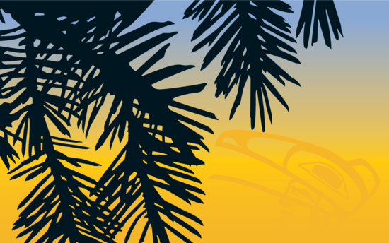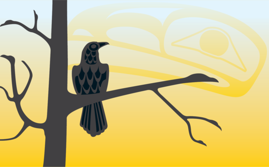 He saw a cedar tree by a little creek, not far from the house. He put on the raven skin and flew up into the branches.